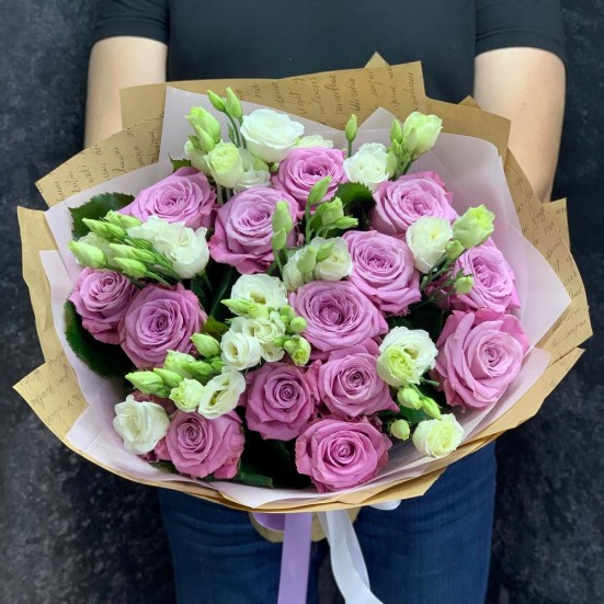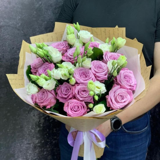 Букет с розовой розой и эустомой в Солнечногорске