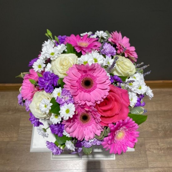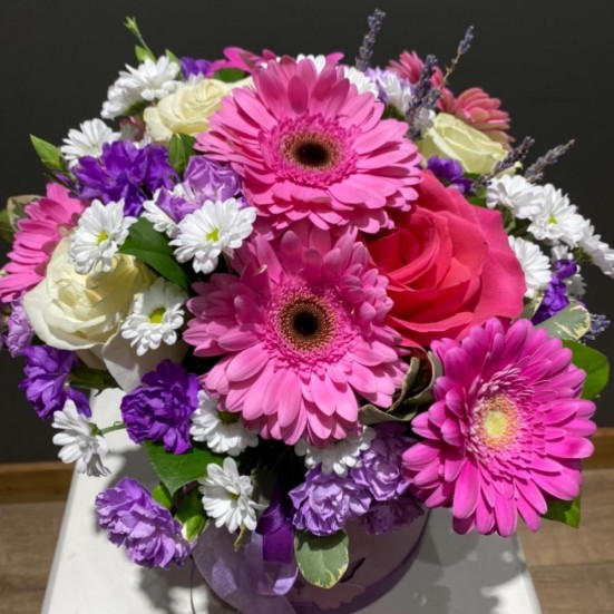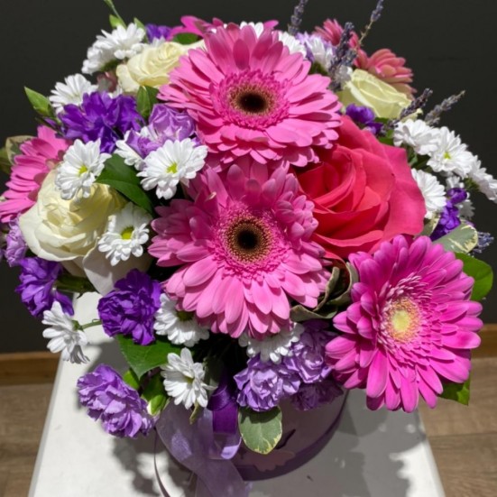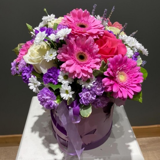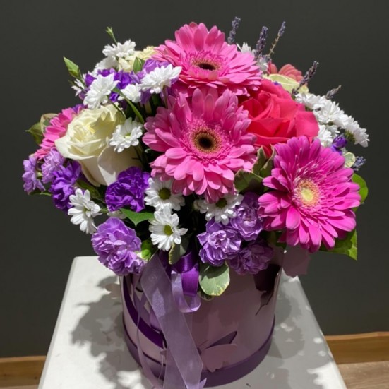 Гербера, хризантема и роза коробке